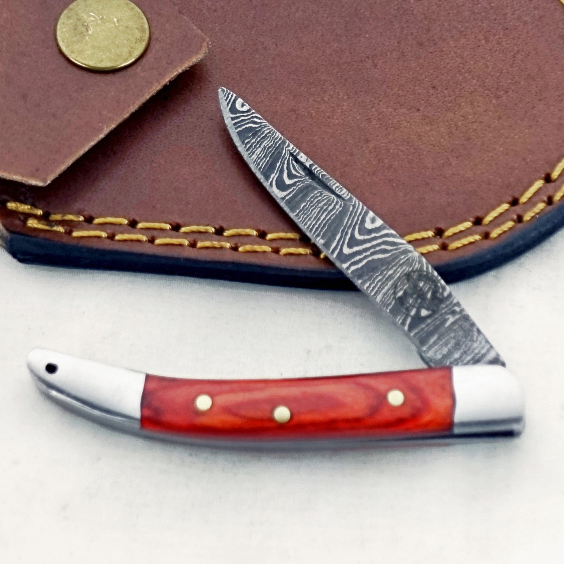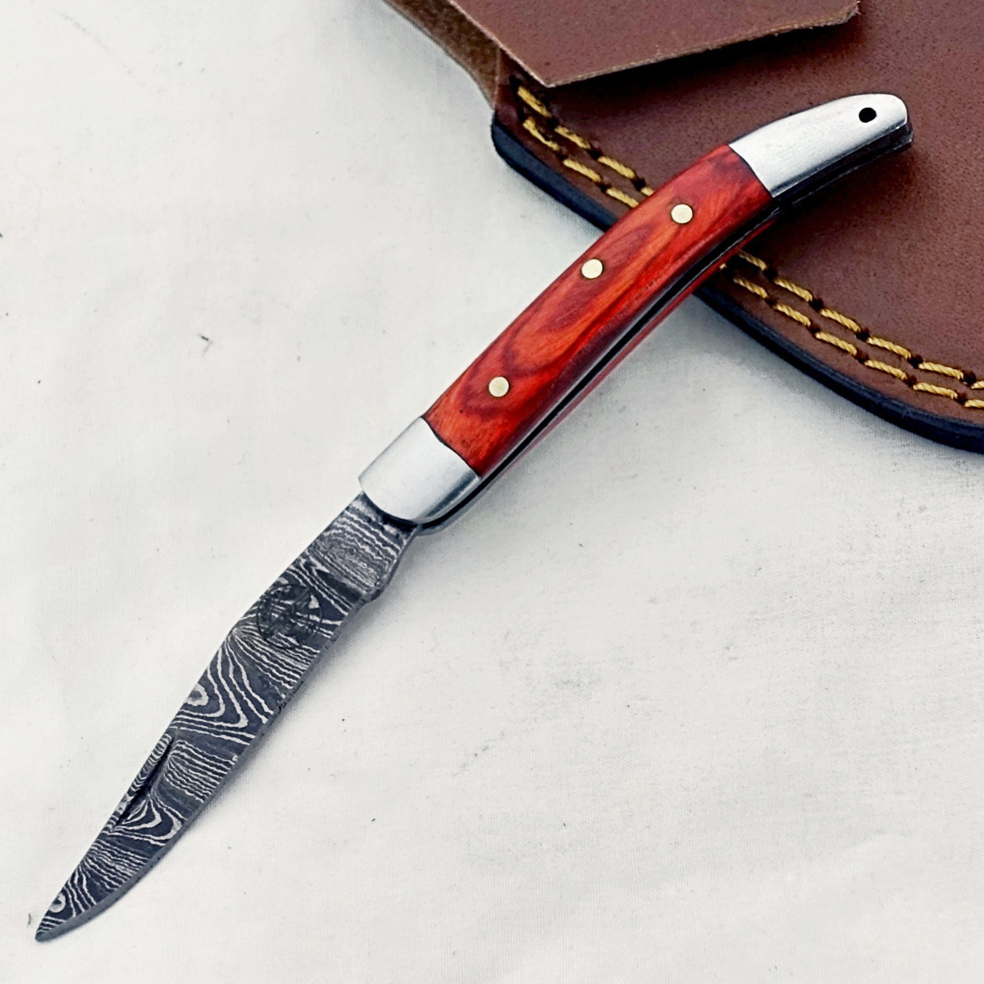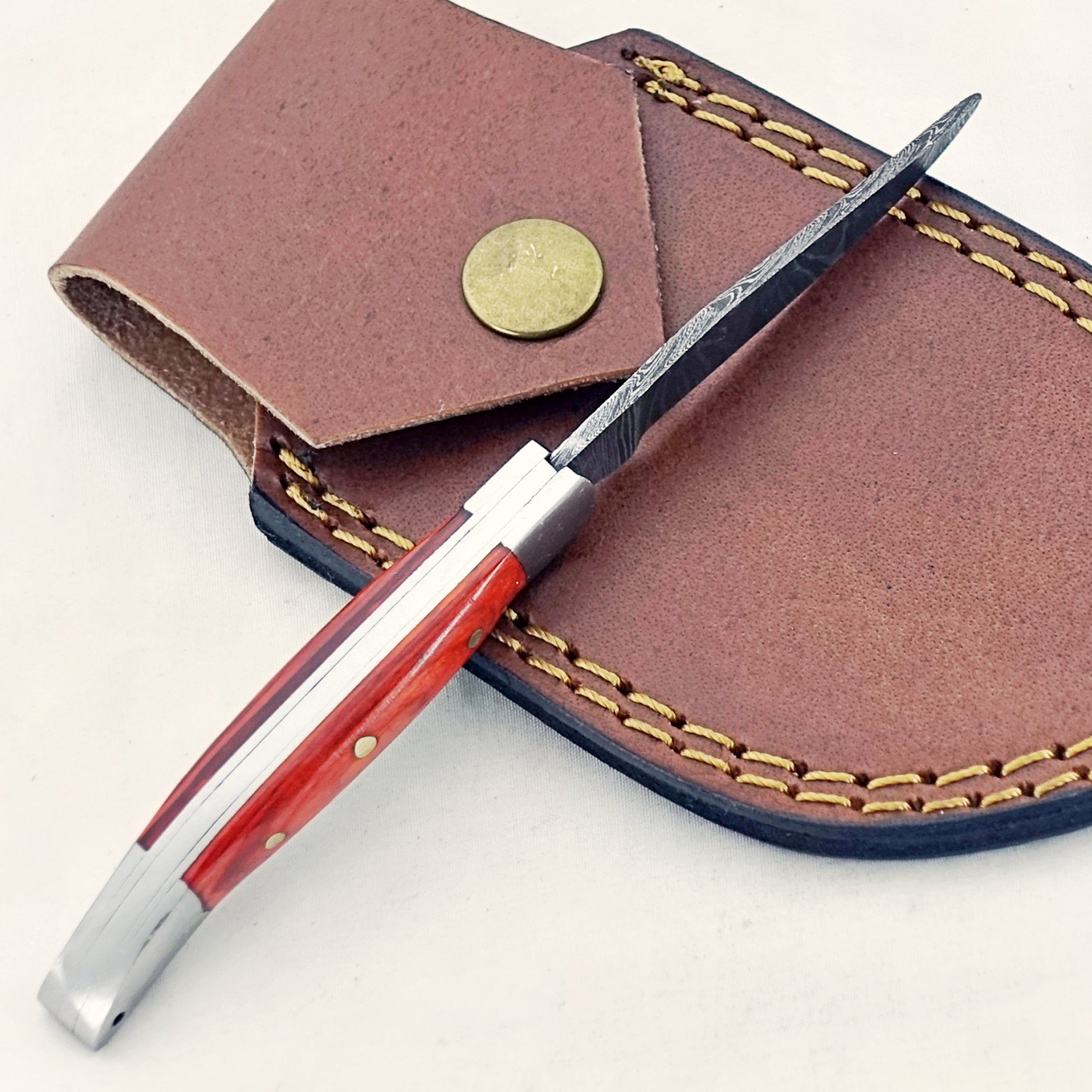 The nylon and plastic handle knives from the local big box fishing shop or gigantic gas station don't hold a candle to these pocket knives. Occasionally, smaller is better and the slim design fits perfectly into your pocket so it's easy to have a great knife nearby for opening mail or cutting a piece of rope. The handsome resin handle in striking turquoise blue accents perfectly with the Damascus steel blade. A must have for any knife collector. A braided leather sheath is included. Imported