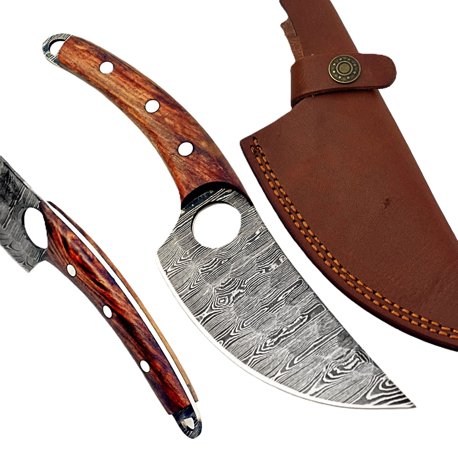 Please note: Each knife is handmade from natural materials, there will be some variation in color, Damascus pattern and overall look. The knife you receive will have the same attention to quality and detail as the one pictured but may differ slightly in appearance.