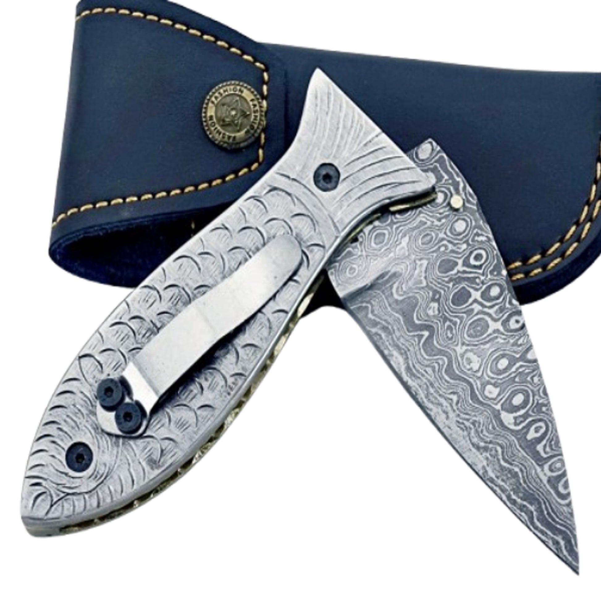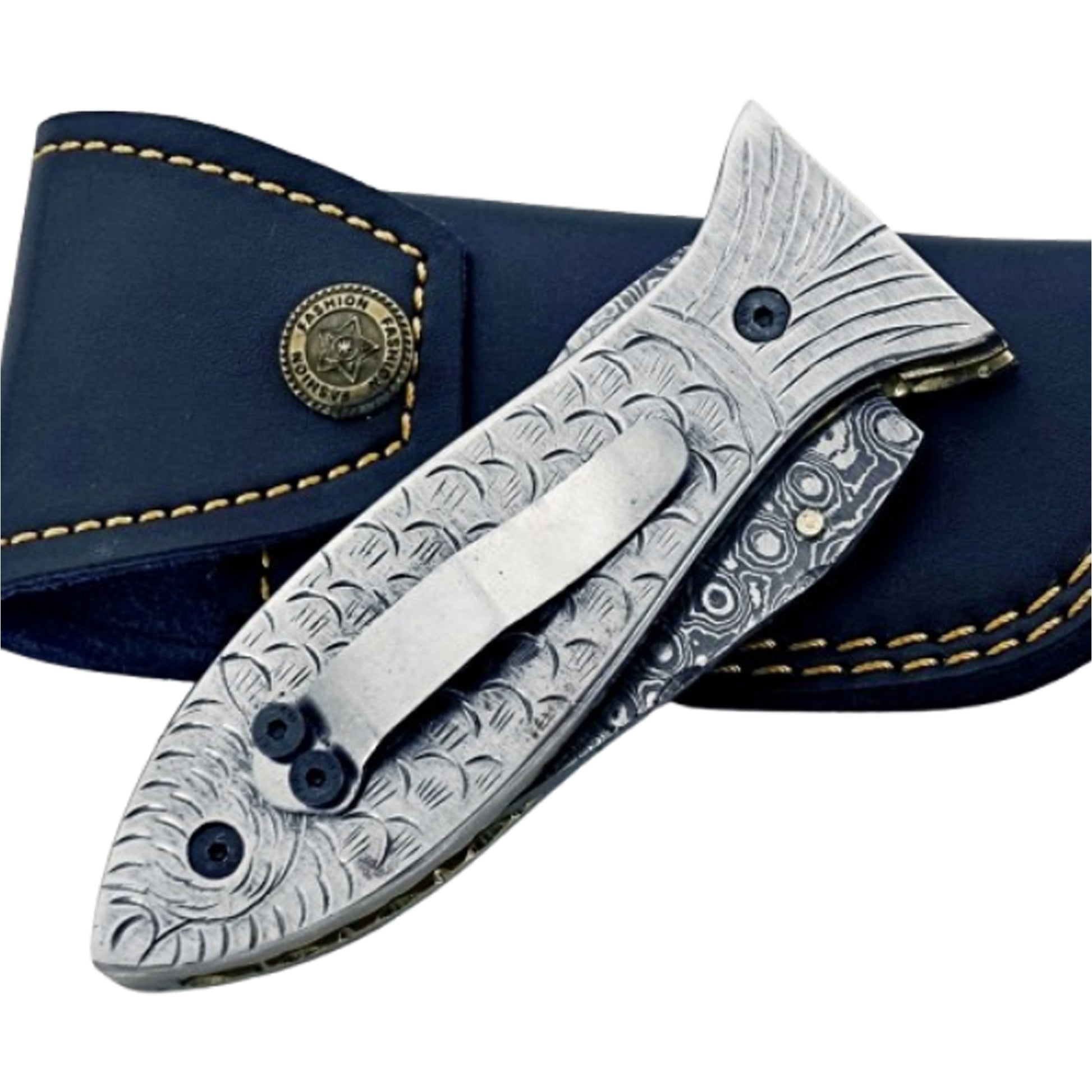 A knife like The Pronghorn would never be found at your local big box fishing shop or gigantic gas station! From the Damascus steel blade to the substantial handle made from Damascus steel, this heavy duty knife weighs over 12 oz. A must have for any knife collector. A leather sheath is included. Measures 8.5" open, 3.5" blade. Imported